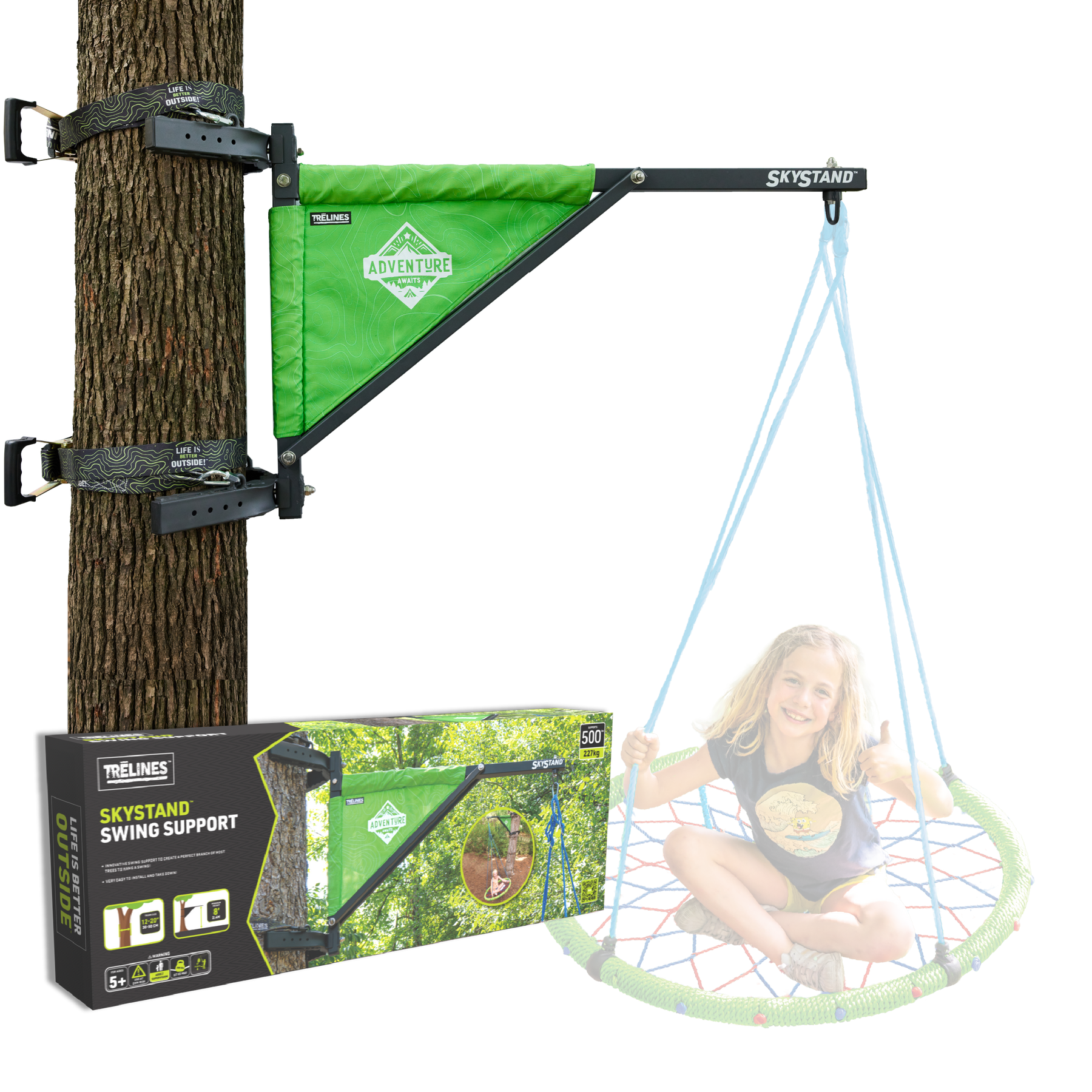 VERSATILE SWING SUPPORT: The SkyStand is an innovative tree swing support designed to create the ideal branch to hang a swing. It extends outward from the tree enough to give swinging space for swings up to 50" in diameter.