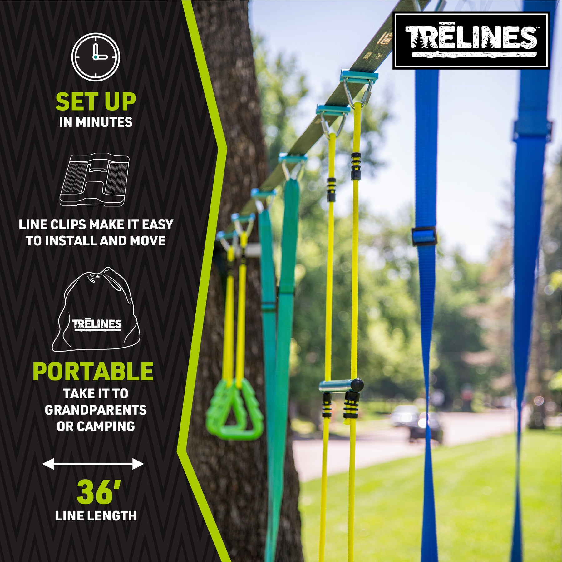1. Swingset & Gymnastics Line Kit – Set up a complete outdoor playground in minutes. Includes a 36 ft line, two adjustable swings, gym rings, and a double trapeze bar.
