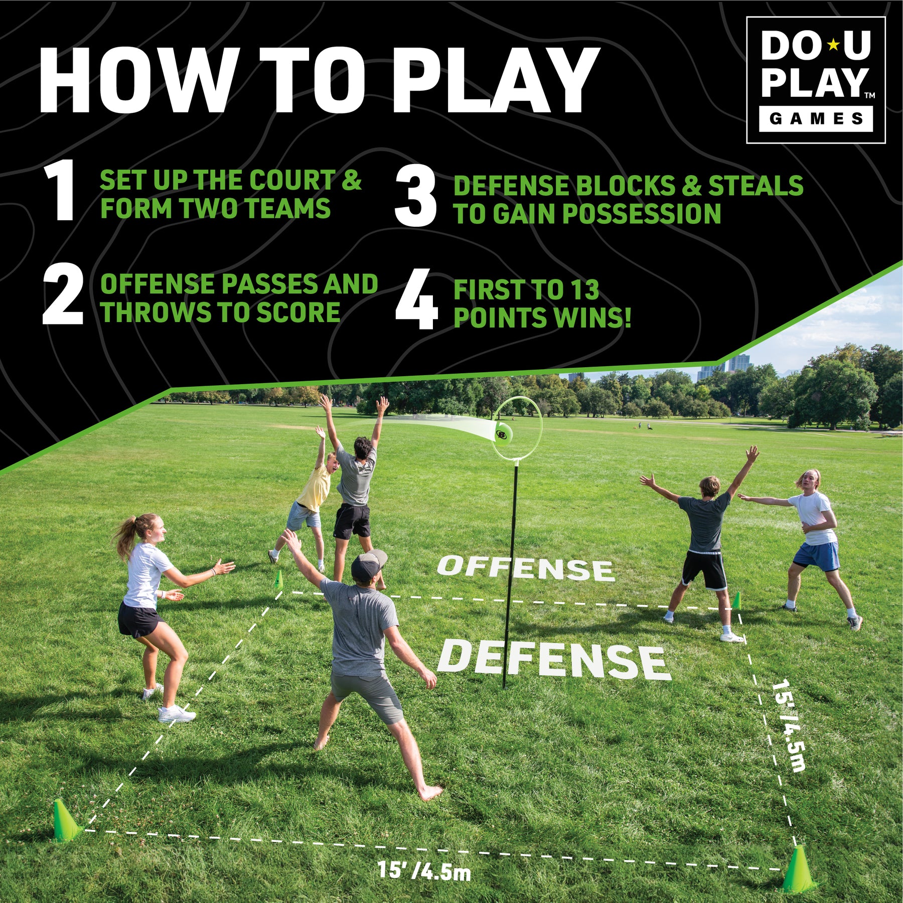 Offensive team stays outside the cones and passes the balls to their teammates to get into position to throw the ball through the goal. Defense try's to block the shot or get ball possession. If the offense scores or the defense steals the ball, the teams switch places. Play continues until a teams scores 13 points and wins!